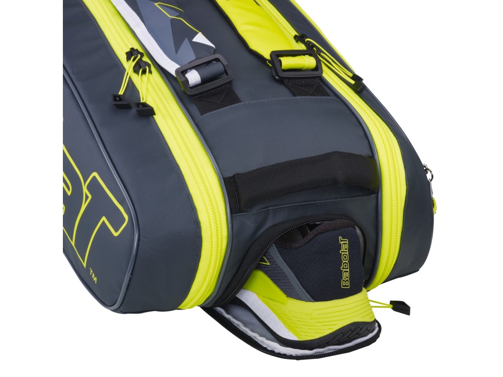 Priestranná a všestranná tenisová taška Babolat RH6 Pure Aero je jednou z našich najobľúbenejších tenisových tašiek so 6 raketami na kurte. Tenisová taška Babolat Pure Aero RH6 je vybavená dvoma hlavnými priehradkami na zips pre rakety a vybavenie, vrátane izolovanej priehradky chrániacej struny pred teplotnými výkyvmi, dvoma bočnými priehradkami na zips pre príslušenstvo a cennosti, priedušnou taškou na obuv a polstrovanými ramennými popruhmi. Vonkajšia časť je odolná a vodeodolná. Vnútri je tenisová taška Babolat Pure Aero RH6 vybavená "bezfarebnou podšívkou" zo 100% recyklovanej a nefarbiacej tkaniny.